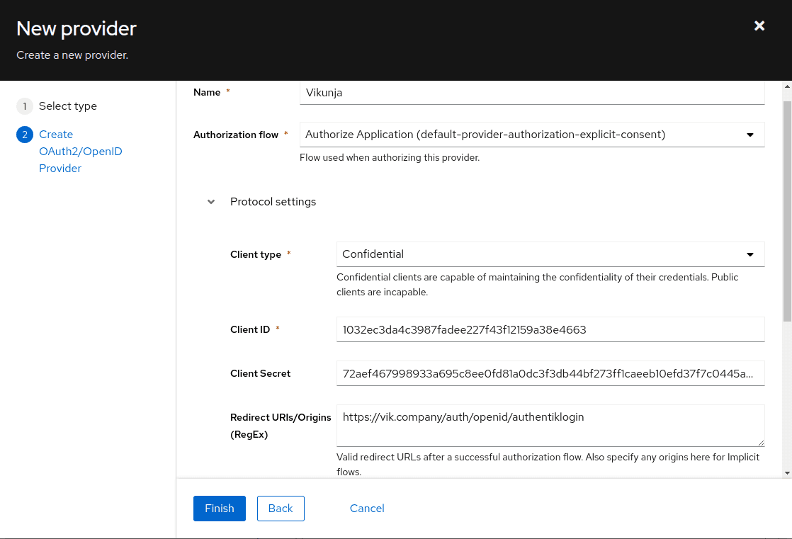 vik.companyis the FQDN of Vikunja.authentik.companyis the FQDN of authentik.authentik Loginis the name shown on Vikunja set in config.yml, and used for the Redirect URI. If the name set in config.yml has capitalization or spaces like in this example, they will be set to lowercase and no spaces in the callback URL, likeauthentiklogin.